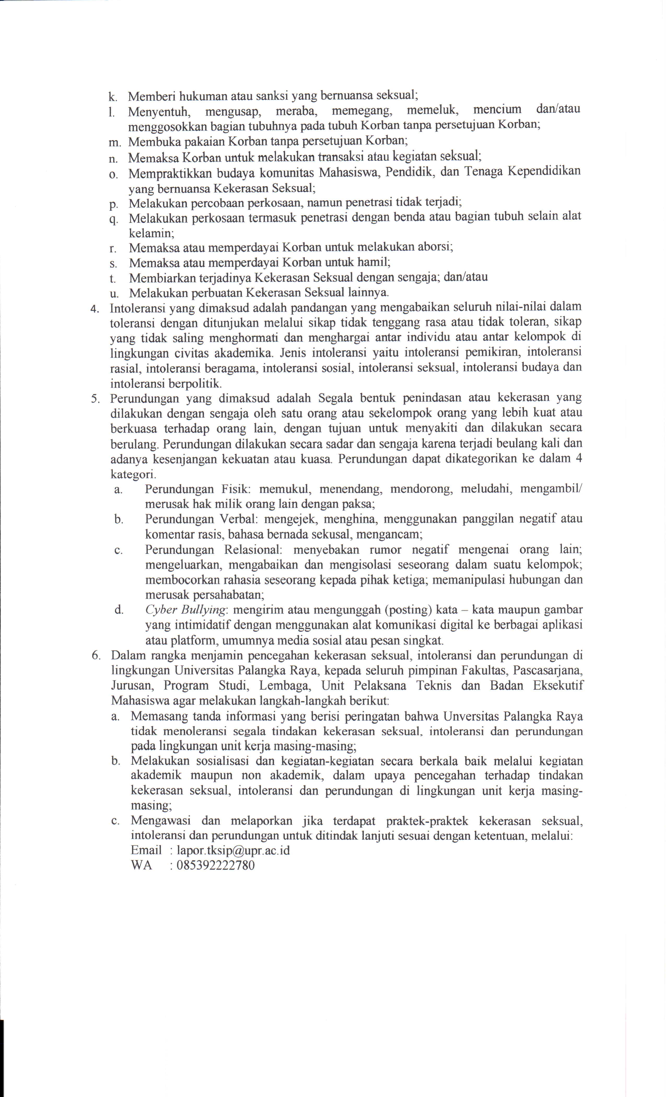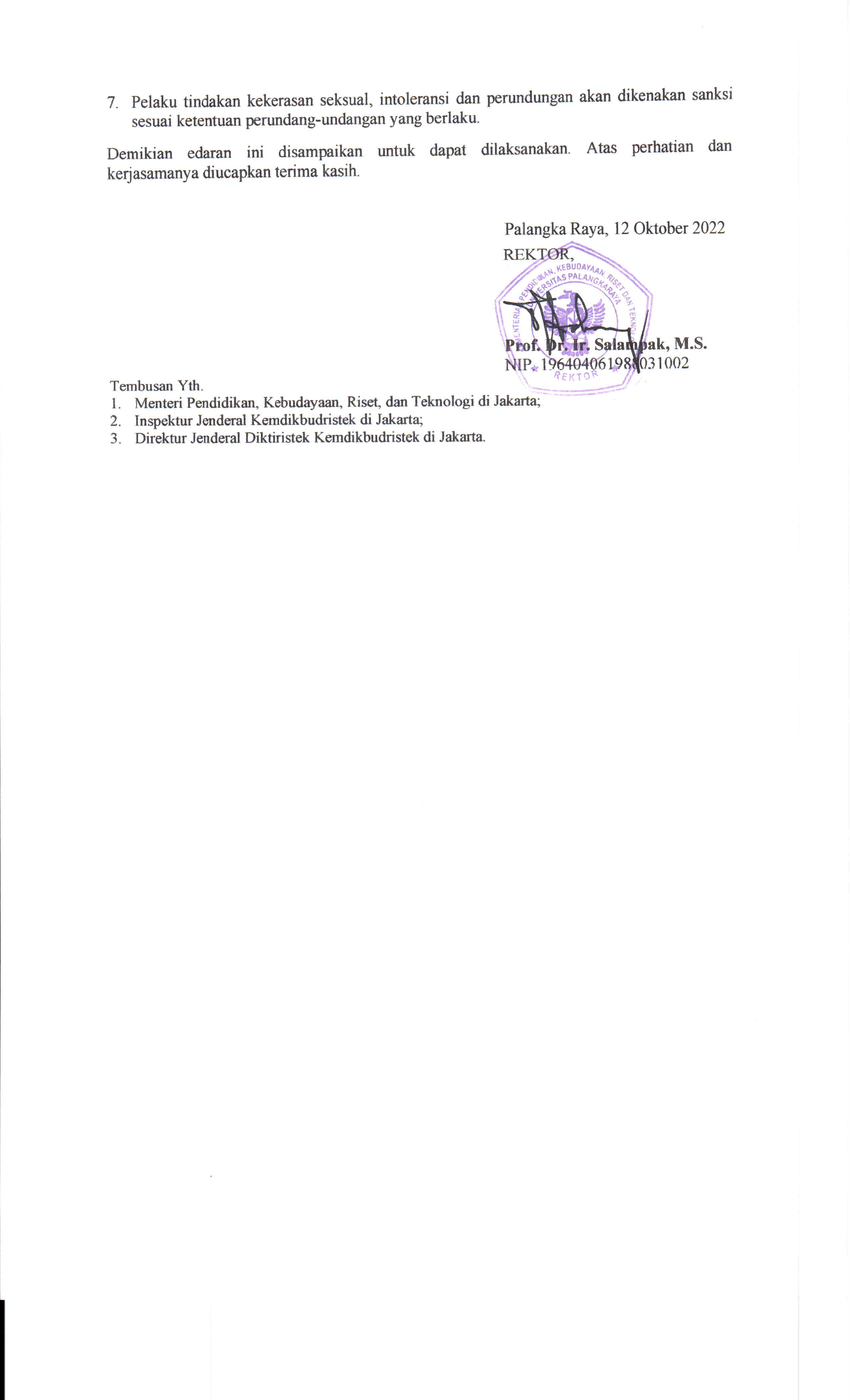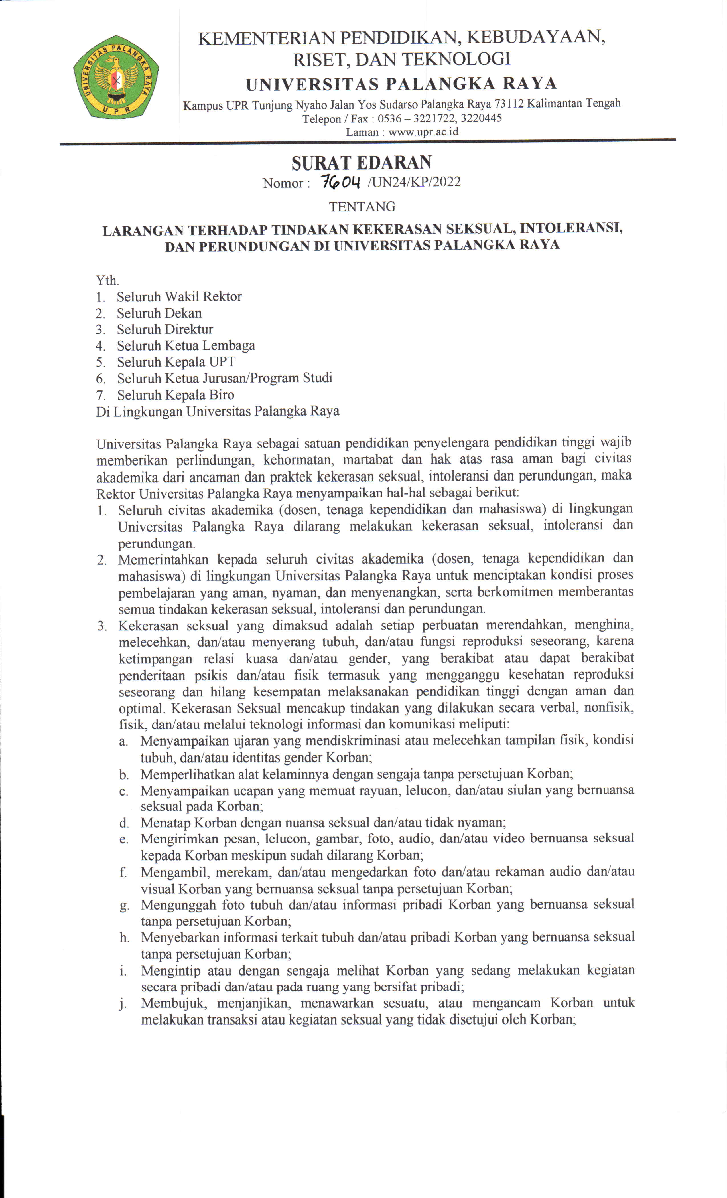 Edaran Larangan Terhadap Tindakan Kekerasan Seksual, Intoleransi, dan Perundungan Di Universitas Palangka Raya
